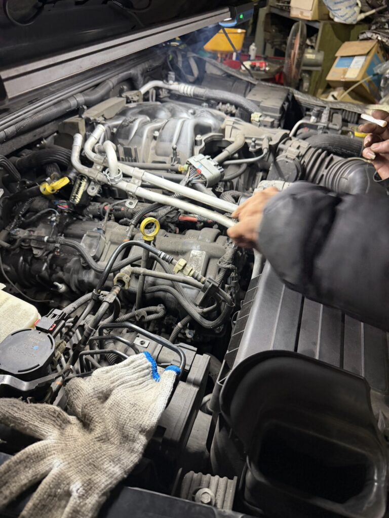 まずはエンジンルームと下回りを徹底的に点検。ラングラーでよく見られるオイルフィルターハウジング付近やパッキン類からの漏れを確認しました。