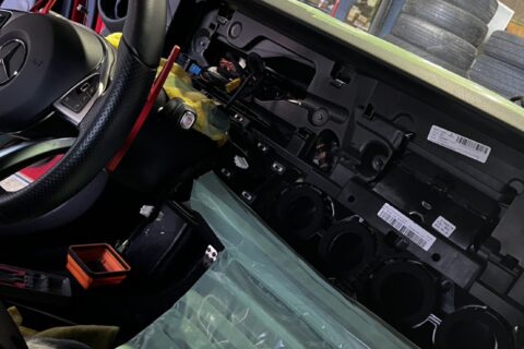 まずはお持ち込みいただいた社外キットの内容を確認し、お車との適合や発光パターンをチェックします。作業は内装の分解から始まりますが、ベンツのドアパネルやダッシュボードは非常にデリケートです。傷をつけないよう養生を徹底し、クリップひとつひとつに注意を払いながら丁寧に取り外していきます。